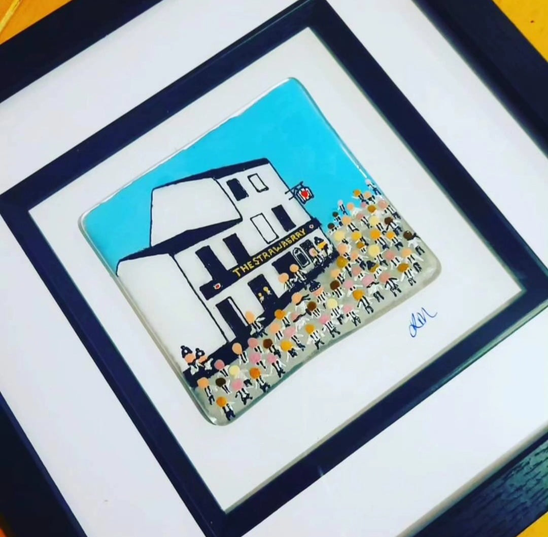 The 10x10 cm glass panel has been melted in a kiln to create a smooth surface. It has then been hand painted using the art of vitrail painting to create the match day scene of loyal Newcastle United supporters on their way to St James Park past the Strawberry Pub.